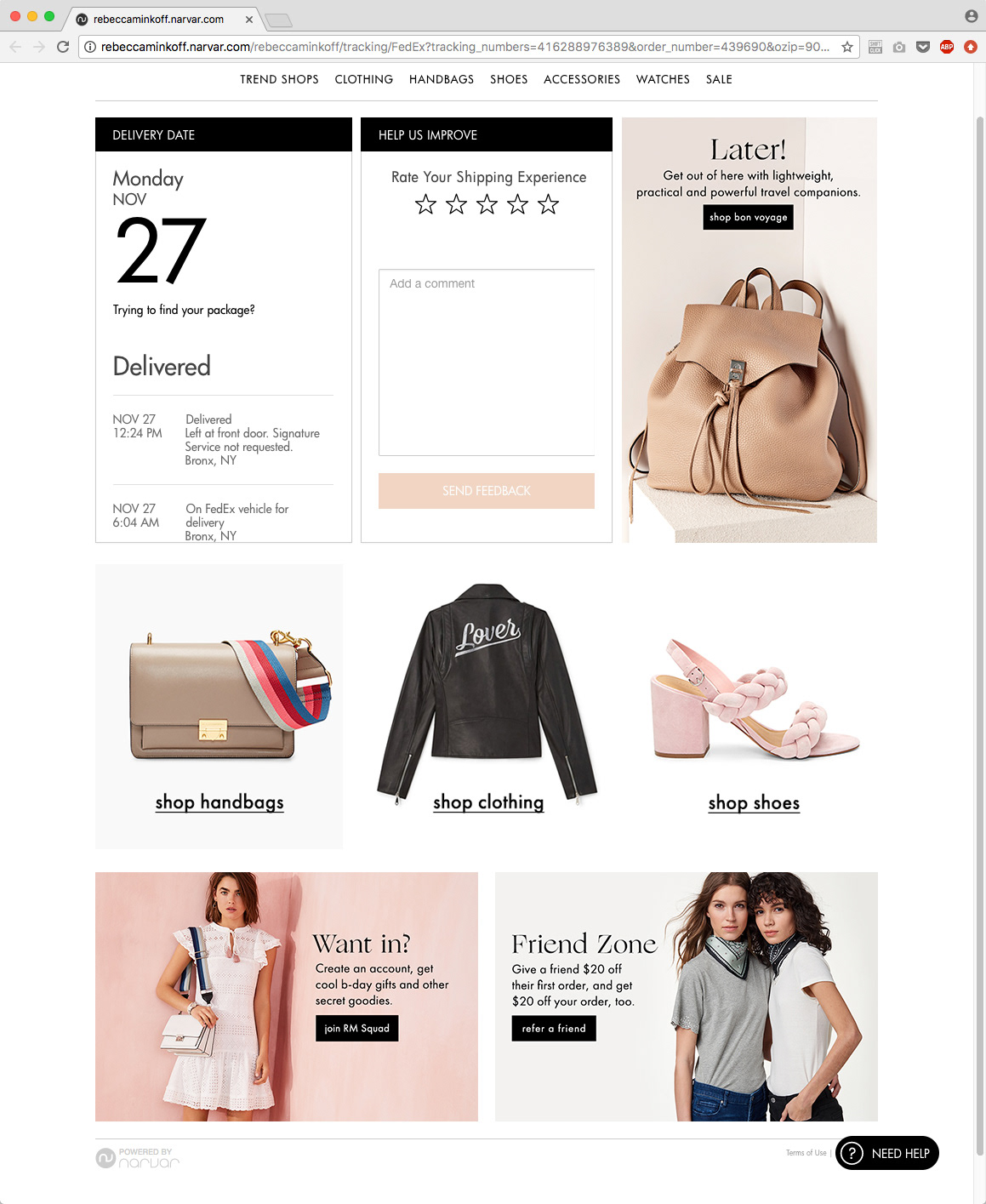 Creative elements designed for various digital touchpoints to engage consumers across their online journey. This included the homepage, Narvar order tracking site, and custom landing pages.